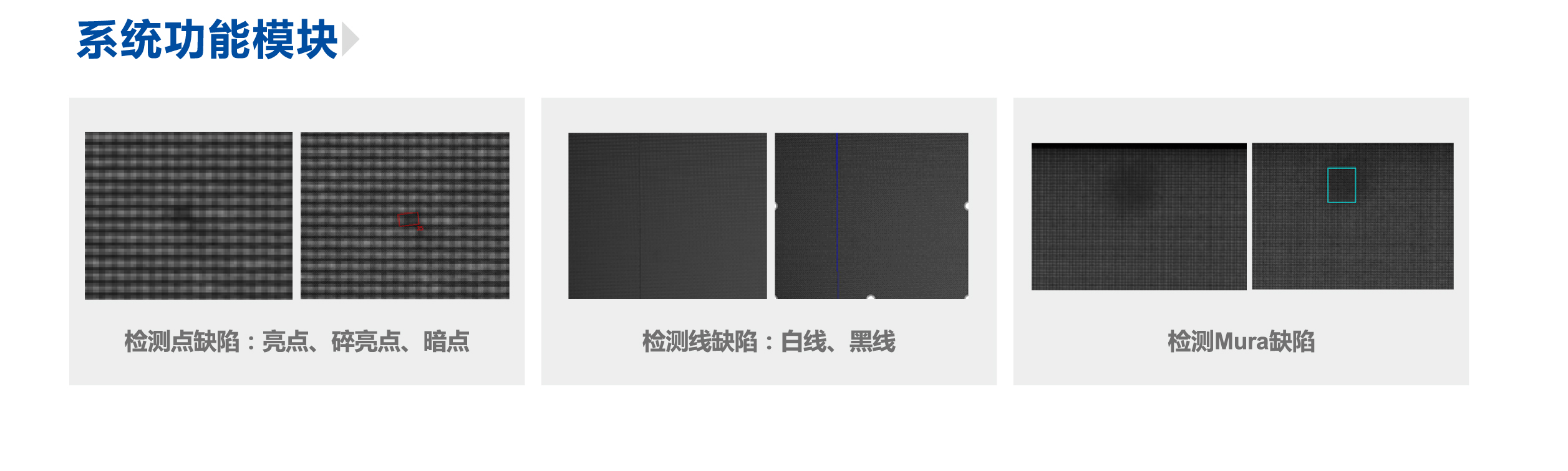 液晶屏顯示缺陷為外觀缺陷,常見的缺陷可分為:點缺陷、線缺陷、MURA缺陷三大類,缺陷可通過人眼在特定條件下分辨出來,因此傳統(tǒng)的液晶屏缺陷檢測常由人工來完成。 但人工檢測方法易受人主觀因素影響,難以檢測微小物體和MURA缺陷,且人眼容易疲勞,有很大局限性。 隨著液晶屏LED、OLED產(chǎn)業(yè)發(fā)展迅速,相關(guān)的制造和檢測設備已經(jīng)呈現(xiàn)出光、氣、電、磁于一體的趨勢,變得越來越自動化、集成化、信息化和智能化。目前很多點燈設備都是離線設備,只能單獨使用。 而在實際的生產(chǎn)過程中,為了保證液晶屏高效生產(chǎn),則希望檢測設備能嵌入在生產(chǎn)流水線中,實現(xiàn)高效率在線檢測,我司全自動點燈檢測設備就是為解決這個方案以實現(xiàn)嵌入式流水線檢測屏幕缺陷。