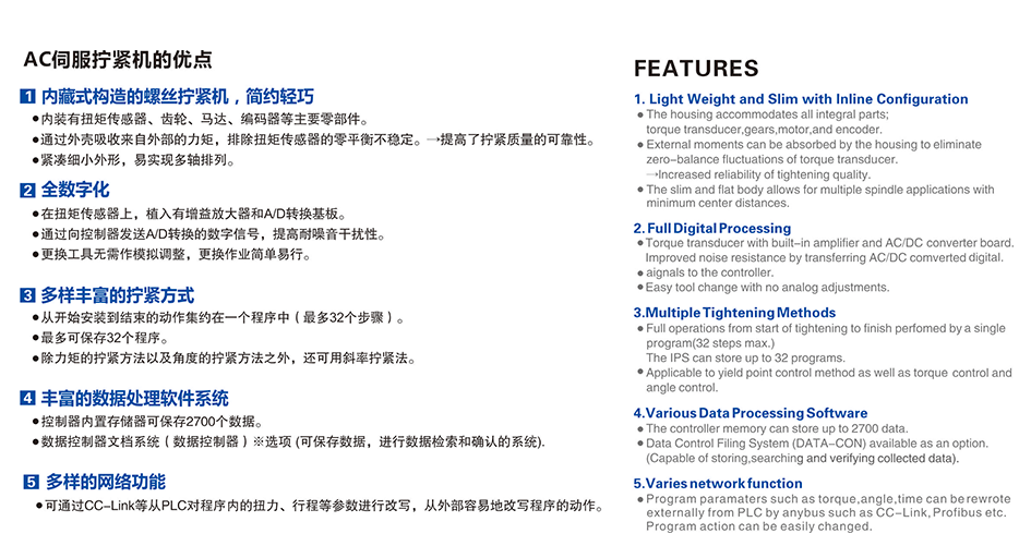 內(nèi)藏式構(gòu)造的螺絲擰緊機(jī),簡約輕巧 全數(shù)字化 多樣豐富的擰緊方式 豐富的數(shù)據(jù)處理軟件系統(tǒng) 多樣的網(wǎng)絡(luò)功能